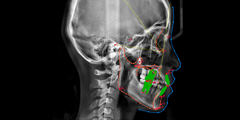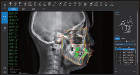 The neural network is trained by mega data, which automatically identifies orthodontic anatomical landmark points, draws anatomical structures and outputs measurement reports according to the selected measurement methods.
